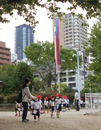 種花事業の次の日。東警察のおまわりさんに教えていただいた交通ルールを守って、中大江公園へお散歩です!かわいいお花もたくさん咲いていました。地域の方と一緒にあげたこいのぼりも、みんながお散歩に来てくれて喜んでいるようでした