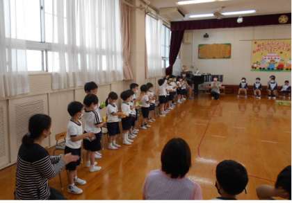 今年度初めての誕生会。みんなで4月生まれのお友達の誕生日をお祝いしました。ばら組さんは、手作りのカスタネットを作ってプレゼントしてくれました。「イチゴ」「サクランボ」と、果物の名前に合わせてとても素敵な音を鳴らして聞かせてくれました。