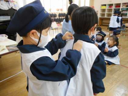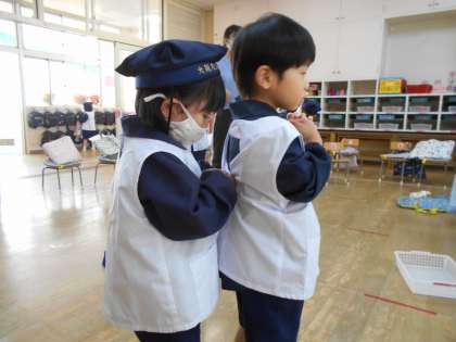 さくら組さんは、お帰りの身支度も少しずつ自分で頑張っています。先生がボタンをとめるお手伝いをしていると・・・かわいい手で、一生懸命お友達のボタンをとめてくれる姿も!きっと毎日、きく組のお兄さんお姉さんにお手伝いしてもらったことが、うしかったんだろうなと、なんだかうれしい気持ちになりました。