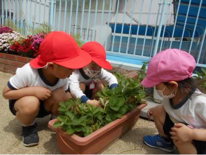 「あー!いちごだ」かわいいイチゴを見つけたお友達