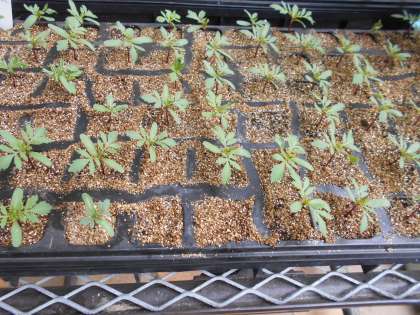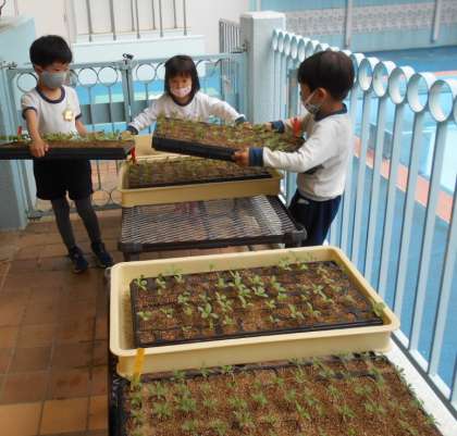 今日も、きく組さんはマリーゴールドとジニアの苗のお世話を頑張っていました。