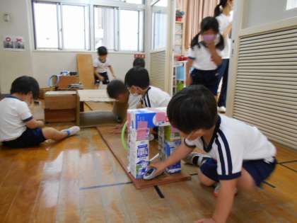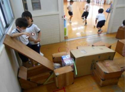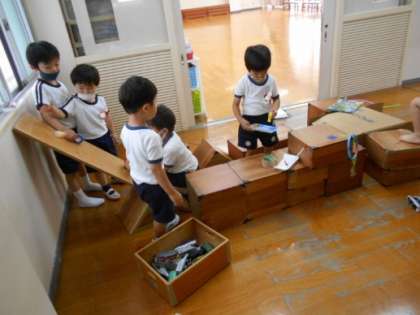 大型積み木や段ボールを組み合わせた道に、プラレールの電車を走らせたり、新聞ボール・ビニールテテープ・ガムテープの芯を転がして遊んでいました。お友達の遊びに興味をもって、一緒にやってみたい!と遊びに加わったり、自分なりに試しながら遊んでいました。