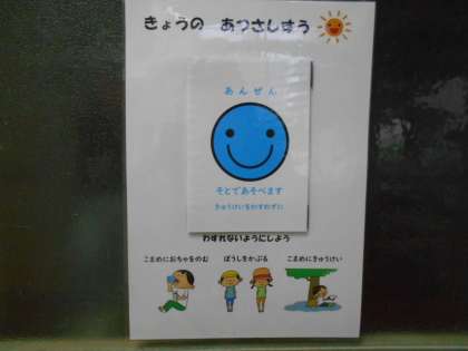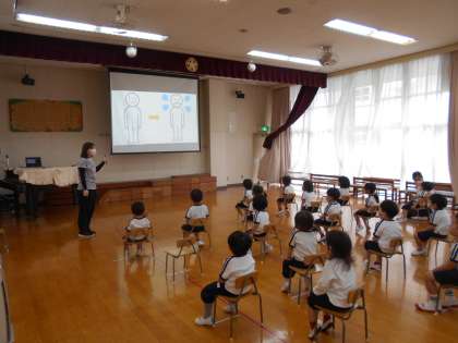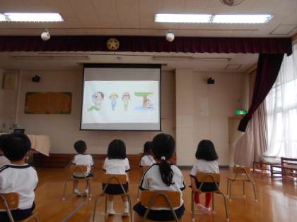 本格的な暑さを前に、元気に過ごすための保健指導を養護教諭の先生にしてもらいました。喉が渇く前にこまめにお茶を飲んだり、帽子をかぶって遊んだりしましょうね。外遊びの途中のお茶タイムでは「体のお水パワーがいっぱいになったよ!」と保健指導を思い出しながら教えてくれた子どもたちもいました。また、「暑さ指数」についても絵表示を使って教えてもらいました。自分の健康への関心が高まるように、機会を捉えて取り組んでいます。