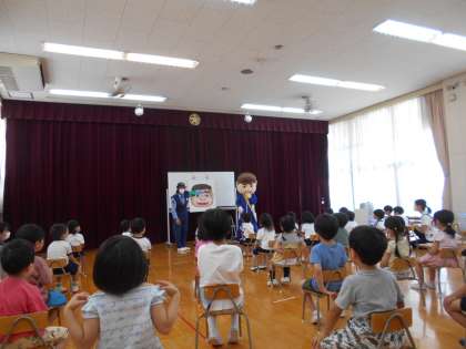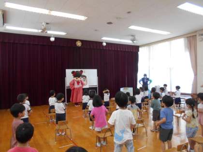 大切な体や命を守るための大切なお話を、着ぐるみや防犯体操を取り入れながらわかりやすくお話してくださいました。知らない人には近づきすぎない、ついていかないなど、公園で遊ぶ時、お家の人とお出かけする時、これから迎える夏休みに向けても大切なお話でした。子どもたちは、とても真剣に聞いていました。