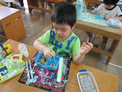 はじめは補助箸を使っていた子どもも友達の姿を見て、