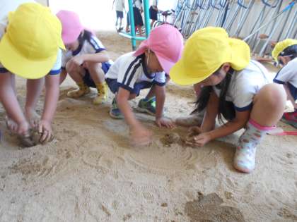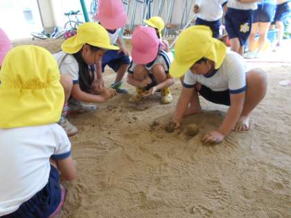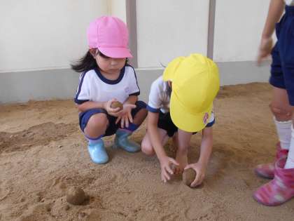 きく組さんが、涼しいピロティーでさくら組さんに、泥だんごづくりを教えてあげていました!さくら組さんも、きく組さんの手元を真剣に見ていました!