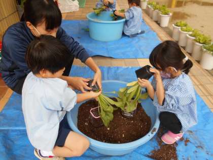 5歳児が中央区役所・地域ボランティア・大阪城公園事務所の方と、一緒に種から育てたキンセンカが立派な苗になりました。地域にかわいい花を咲かせてくれることが楽しみです。たくさんの苗は、みんなのお家にもおすそ分けできることになりました。大切に育ててみてくださいね。