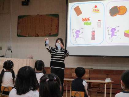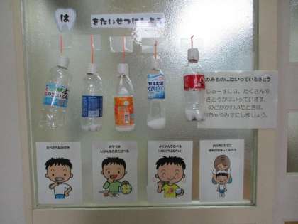 歯がどのようにむし歯になるのか、むし歯になりやすいおやつ、なにりくいおやつ、歯を大切にするためにできることなどを知らせました。砂糖を含んだ甘いものを食べると、口の中のむし歯菌(ミュータンス菌)が活発に働き、酸をつくります。この酸によって歯が溶かされむし歯になります。普段口にするおやつやジュースにはたくさんの砂糖が入っています。どのくらい砂糖が入っているのか、視覚的な教材で知らせました。子どもたちは「お茶には砂糖が入ってないね」「(甘い)おやつと茶にしたらいいんじゃない」など興味をもってみている様子でした。むし歯にならないためには、おやつは時間を決めて食べる(だらだら食べをしない)、よく噛んで食べる、食べたら歯みがきをすることが大切です。また、定期的に歯医者さんで診てもらいましょう。