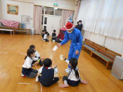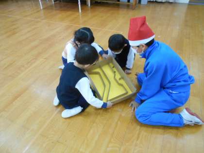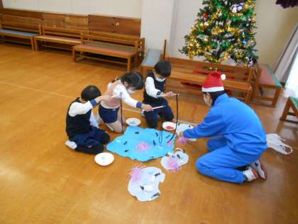 東中学校1年生の生徒さんと、4歳児・5歳児の子どもたちが交流をしました。中学生が家庭科の授業で作った、手作りおもちゃを持ってきてくれました。子どもたちは楽しそうなおもちゃと、優しく遊び方を教えてくれるお兄さんお姉さんに目をキラキラさせて夢中で遊んでいました。小さな子どもたちに合わせ、言葉を選び、一緒に遊んでくれる中学生姿がとても素敵でした。活動の振り返りでは「とっても楽しかったよ」という園児に「笑顔で、楽しく遊んでくれて、私たちもとてもうれしかったよ」とこたえてくれた中学生。ふれあいを通して心もつながったなと感じました。東中学校の生徒さんありがとうございました!