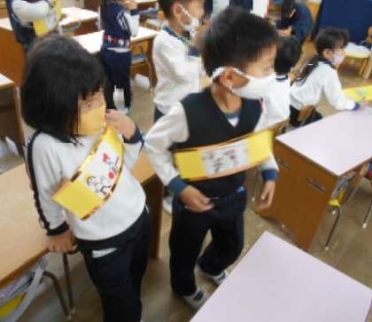 保育修了式の前日、きく組さんが、ばら組・さくら組・教職員に素敵なプレゼントを贈ってくれました。かわいい絵を描いた「ペンダント」と「たすき」です。「一緒に遊んで楽しかったね!」「ありがとう!」という思が溢れていました。きく組さんの優しさを、しっかり受け取りましたよ。