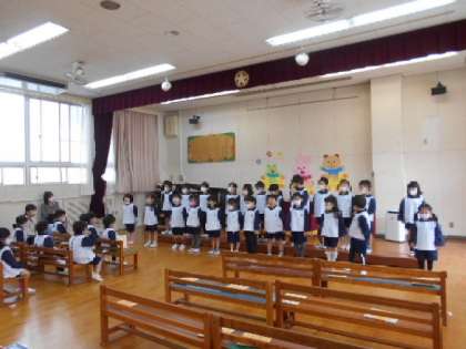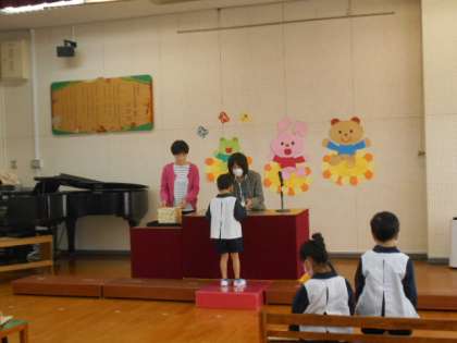 担任の先生に名前を呼ばれ、一人一人が園長先生から進級祝いの絵本をいただきました。嬉しそうな顔、たくましい顔、ドキドキした顔、それぞれの子ども達の表情に、心も体も大きく成長したことを実感しました。
