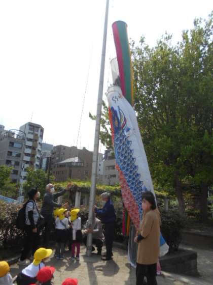 ばら組(4歳児)・きく組(5歳児)が、いつも子どもたちの成長を見守ってくださっている地域の方々と一緒に、中大江公園にこいのぼりをあげました。こいのぼりさん、今日も元気に泳いでいるかな?