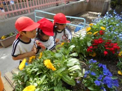 ぽかぽかのお庭は、お花がいっぱい!虫たちもいっぱい!子どもたちの「見つけた!」「見て見て!」の声もいっぱいです。身近な自然を通して、心を動かしながら遊んでいます。