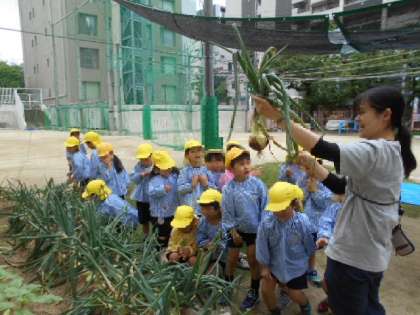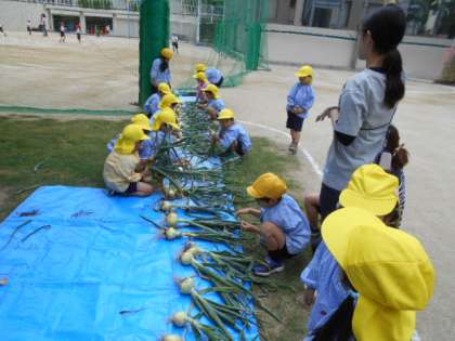 「うんとこしょ!どっこいしょ」とかけ声を掛けて玉ねぎを抜いていました。「大きいよ!」「わあー!たまねぎの匂い!」「ひげがいっぱい!」と、感動や発見したことをお友達や先生と知らせ合っていました。