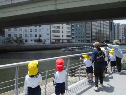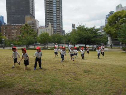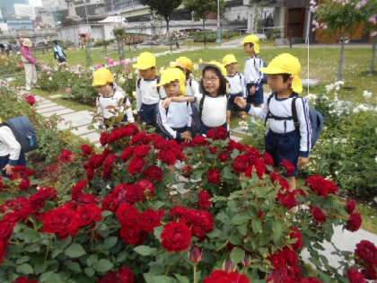きく組(5歳児)ばら組(4歳児)が、中之島公園に電車で遠足に行きました。5月のさわやかな風を感じながら、きれいなバラをたくさん見ることができました。広い芝生で遊んだりお弁当を食べたり、お船に手を振ったりと楽しい園外保育でした。