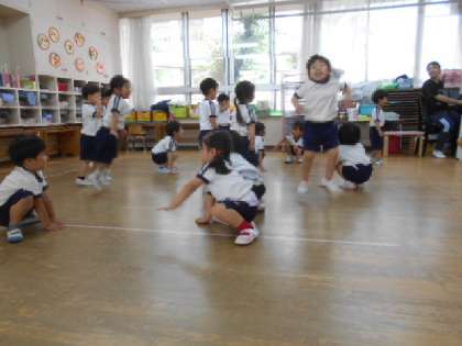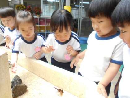 さくら組(3歳児)は、ちいさなお友達のダンゴムシに夢中です。他にも、大好きなザリガニの水槽の水かえにも興味津々。ザリガニが驚いてハサミを振り上げると、子ども達は「わー」と大興奮でした。いろいろな生き物に触れる直接体験や、絵本を通してイメージを広げたり、ピアノに合わせて先生や友達と一緒になりきって楽しんだりしています。