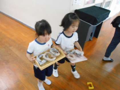 「さくら組さんには、かわいい小さいドーナツをもってきたよ」というと、さくら組も嬉しそうにドーナツを受け取っていました。「イチゴのドーナツもほしい!」と注文されると、大急ぎでお店に戻って、ドーナツを届けていました。遊びを通して、異年齢のかかわりが日常的にみられるようになってきました。