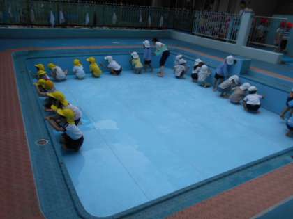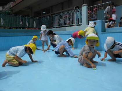 この日は、きく組(5歳児)が「プール開き」に向けて、プールのお掃除をしてくれました。ばら組(4歳児)さくら組(3歳児)の「頑張ってー」の応援を受けながら、プールをスポンジで磨いてくれました。「真っ黒になった」とスポンジを見せ合ったり、「ここが汚れてる!」と、こまかい隙間まで丁寧にお掃除してくれました。自分たちの力で身近な環境を整える心地よさや、みんなのために力を合わせる達成感を、子ども達の表情から感じました。
