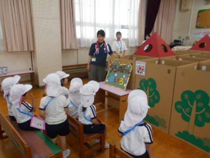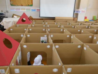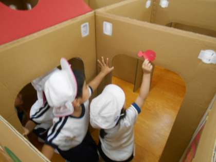 遊戯室には、楽しい段ボール迷路が!絵本『きんぎょが にげた』の金魚を目印に、ゴールを目指しました!