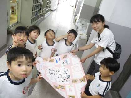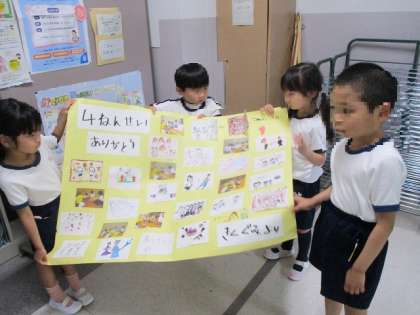 中大江小学校の4年生の教室へ、絵本を読み聞かせてくれたお礼のお手紙を届けにいきました!緊張していた園児も、教室に入ると4年生や小学校の先生の笑顔や「かわいい!」という声にホッとした様子でした。「絵本を読んでくれてありがとう!」とみんなで伝えることができました。