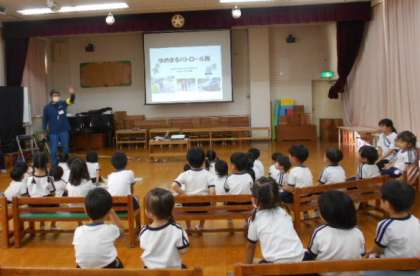 今日は、いつも子どもたちの安心安全のために、地域をパトロールしてくださっている中央区役所・地域安全防犯「ゆめまるパトロール隊」の方と、東警察・生活安全課防犯係のおまわりさんに、夏休みにむけて防犯指導をしていただきました。防犯標語「いかのおすし」のお話を聞き、不審者に声を掛けられた時の声出し体験などをみんなでしました。本日、防犯啓発ブックも配付していますので、お家の方も子どもたちと一緒に夏休みに向けて、防犯について考える機会にしてみてください!