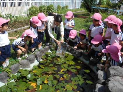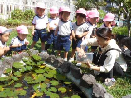 さくら組(3歳児)が、保育室で大切に育てたおたまじゃくしがカエルになりました。広いお池で泳げるようにと、中大江小学校の「科学園」のお池にみんなで逃がしてあげました。カエルさん!元気でね!