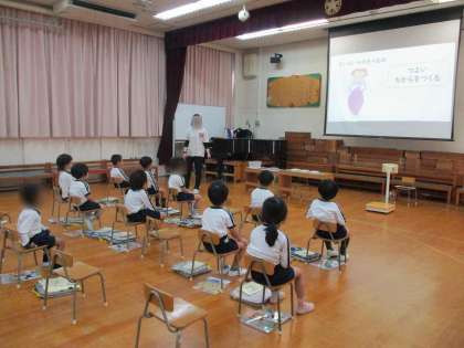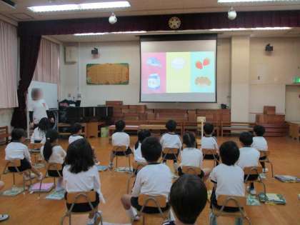10月は「栄養」についての保健指導を行いました。食品は働きによって3つの色に分けることができます。それぞれの役割を知らせ、好き嫌いをせず食べることの大切さを知らせました(詳しくは後日配付のほけんだよりをご覧ください)。年中・年長児には食べ物を見て何色に分けることができるかのクイズを行いました。食べ物の色に惑わされることなく答えることができていました。子どもたちには「好き嫌いせずなんでも食べて毎日を元気に過ごそうね」と話しています。ご家庭でもバランスの良い食事を心がけてください。