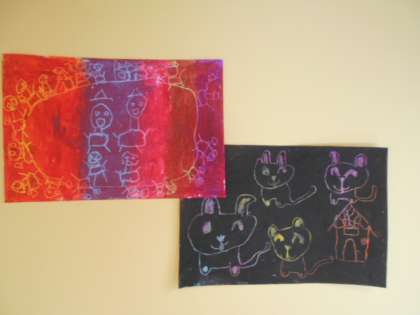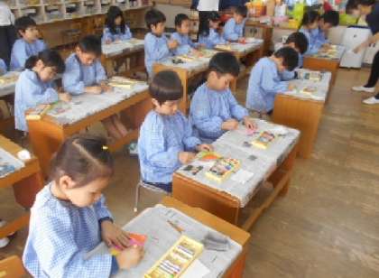 きく組さんが、クレパスのスクラッチ技法で絵をかいていました。クレパスを塗り重ねた後に、割りばしでひっかくと、下に塗ったクレパスの色が見えて、素敵な絵になります!日頃から親しみのあるクレパスの面白い表現方法に、目を輝かせていたきく組さんでした。