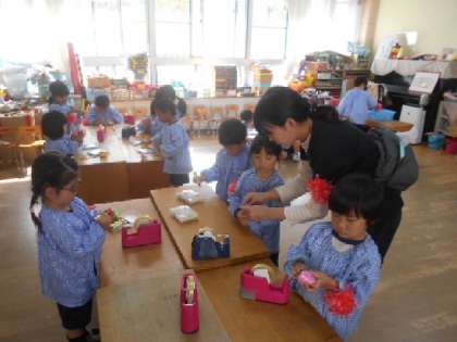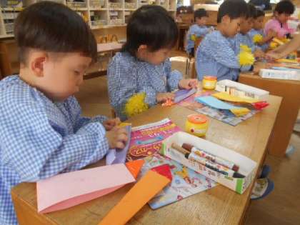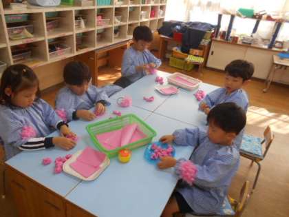 ももチームはカラフルなクリーム、いちごチームはかわいいイチゴ、ひまわりチームは素敵なローソク、ほかにも美味しそうな果物をかいたりつくったりしていました。どんなケーキが出来上がるか楽しみですね。