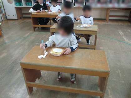 年中児を対象に箸の持ち方の保健指導を行いました。箸の持ち方を知らせた後、スチロール材を箸でつかむ練習をしました。最初はうまくつかむことができませんが何度も何度も挑戦していました。つかむことができると、「見て!できたよ!」ととても嬉しそうにしていました。弁当の時間にも箸に挑戦していました。自分で持ち方を確認しながら頑張っている姿が見られました。