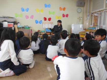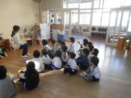 なかよしタイム 公開日 2023/12/08 更新日 2023/12/08 幼稚園日記 今日のなかよしタイム(異年齢での遊びの時間)は、チームの先生に絵本を読んでもらったり、一緒に歌を歌ったり、手遊びをして楽しく過ごしました。5歳児が3歳児の友達に「(絵本)見える?大丈夫?」と優しく声をかける姿や、自分のクラスに帰る時には「ばいばーい!」と笑顔で手を振り合っていました。いろいろな友達との関りの中で、優しい気持ちや親しみが育っているなと嬉しく感じました。 いいね(0)