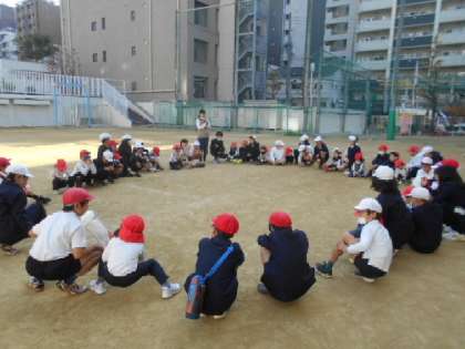 5年生は園児に「一番高く飛んでたよ」「もう少し糸を短くしてもいいよ」等、優しく声をかけながら一緒に凧あげをしてくれました。振り返りの時間で園児は「楽しかった!」「凧が飛んでうれしかった」と、自分の思いを発表していました。5年生は「幼稚園のみんながかわいかったです」「幼稚園の子が凧にかいた絵が上手だった。その凧が高く上がってよかったです」「幼稚園の子が走るのが早くてびっくりしました」と、発表しくれました。また、5年生の先生も「幼稚園の子どもたちと手を繋いだり、優しく声をかけている姿がうれしかったです」とおっしゃっていました。みんなが笑顔でふれ合うことができた幼小交流でした。