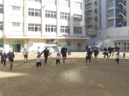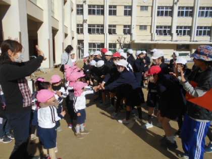 今日は、3歳児と5年生が一緒に凧あげをしました。5年生はとにかく3歳のさくら組がかわいいようで、ひざに乗せてくれたり、目線を合わせてお話をしてくれたりしていました。「最後に、ぎゅーってしてくれて、めっちゃうれしかった!」と言っている5年生もいました。「また遊びに来てね!」と、名残惜しくさよならしましたが、給食後の休み時間に5年生が本当に幼稚園に遊びにきてくれました。園庭で遊んでいたさくら組は大喜び!一緒に砂場で大きなお山をつくりました。また、幼稚園に遊びに来てくださいね!
