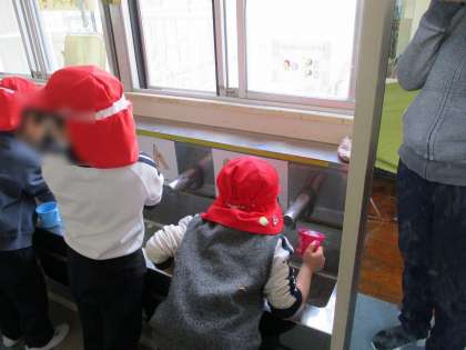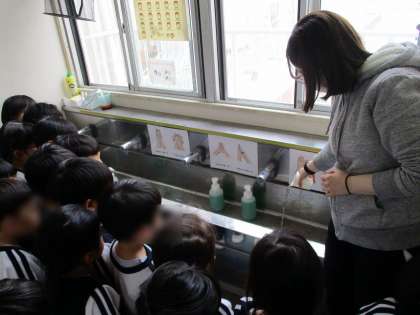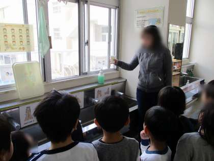 うがいの水は優しく吐き出すことも知らせました。手洗い場にテープで線をつけ、線より上から勢いよく吐き出す時と線より下からそっと吐き出す様子をコップを使って知らせました。実際に2つの場面を見たことで、指導後は線を意識してそっと水を吐き出す姿が見られるようになりました。うがい名人になって3学期も元気にすごしましょうね♪