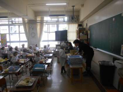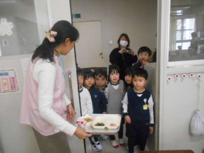 きく組(5歳児)が中大江小学校1年生の給食を参観しました。小学校生活へのイメージが広がり、就学への安心感につながってほしいと願って幼小で計画した交流です。