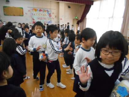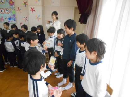 もうすぐ修了を控えた、きく組(5歳児)のおわかれ会を行いました。みんなで、クイズ大会や大好きな体操、プレゼント交換をして楽しく過ごしました。最後は、ばら組(4歳児)・さくら組(3歳児)が花道を作ってくれました。来週も、みんなでたくさん遊びましょうね!