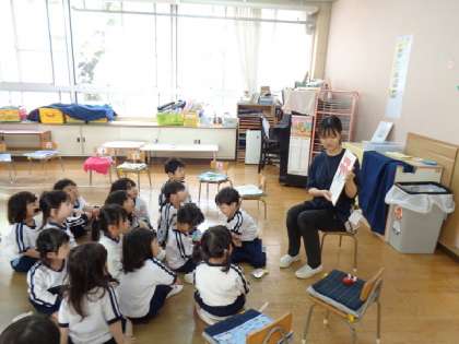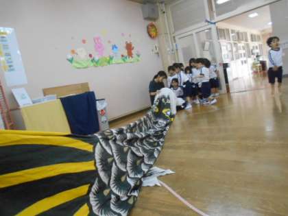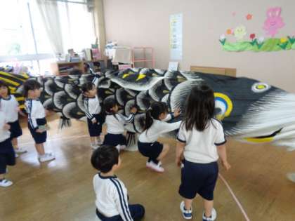 さくら組(3歳児)が、先生にこいのぼりのお話を聞いたり大きなこいのぼりをトンネルのようにくぐって遊んでいました。幼稚園のこいのぼりのように、元気におおきくなーれ!