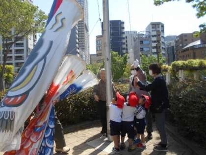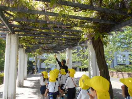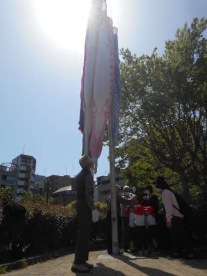 4・5歳児が中大江公園愛護会の方と一緒に 中大江公園にこいのぼりをあげました 子どもたちがこいのぼりのように元気いっぱい大きく成長しますように! 公園にはきれいな藤の花も咲いていました。