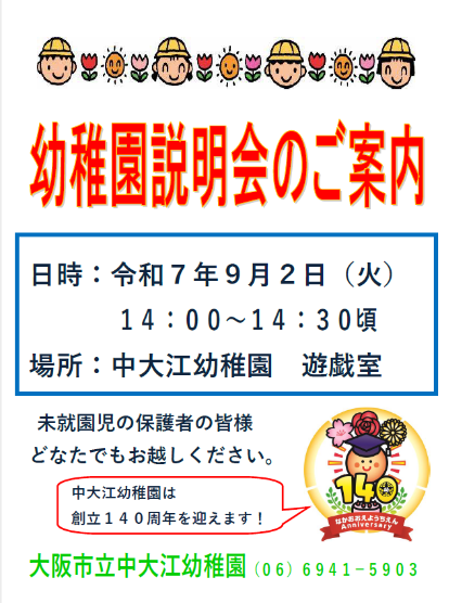 幼稚園説明会 公開日 2025/07/24 更新日 2025/07/24 幼稚園日記 令和8年度園児募集に向けて、幼稚園説明会を行います。 中大江幼稚園の園生活の様子等をお知らせします。 日時 9月2日(火) 14:00〜14:30 場所 中大江幼稚園 遊戯室 皆様、ぜひお越しください! いいね(0)
