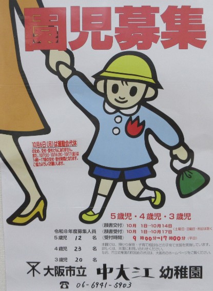 令和8年度大阪市立中大江幼稚園の「園児募集」について、願書交付・受付の日時・募集人数などが決まりました。