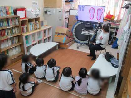 9月はけがの予防として、靴について保健指導を行いました。靴下のまま部屋を歩くと滑ってけがにつながることや正しい靴の履き方などを知らせました。靴を履く時は、つま先ではなく踵に合わせるのが正しい履き方です。踵に合わせることで、つま先の周りにゆとりができ、指を自由に動かせるようになります。指は身体のバランスをとるために様々な動きをするので、つま先にゆとりがないと動きが制限されて足元が不安定に状態になります。2学期は運動会や園外保育など体を動かす活動がたくさんあります。足に合った靴や正しく靴を履いて、元気いっぱい遊びましょう!