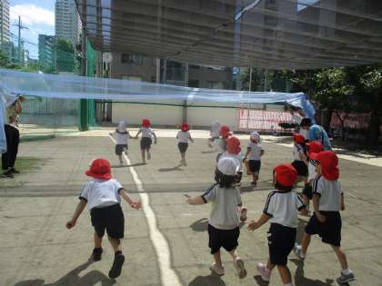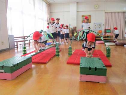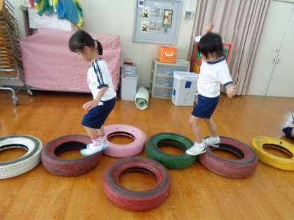 サーキットでは、それぞれの遊具をジャングルの世界に見立てて遊んでいます。平均台は橋、タイヤはゴツゴツした岩、長い布は大きな川など、友達とジャングルのイメージを共有し、体を動かす楽しさを味わっています。