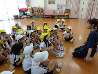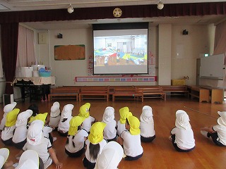 きく組(5歳児)はパラバルーンで、曲に合わせていろいろな技に挑戦し、楽しんでいます。この日は、自分たちがパラバルーンをしている動画を見て、パラバルーンが大きく膨らんだことやボールが上にあがったことを教師や友達と喜びました。また、うまくいかなかったことは、次はどうしたら良いかをその都度クラスで考え、友達と力を合わせる楽しさを感じています。