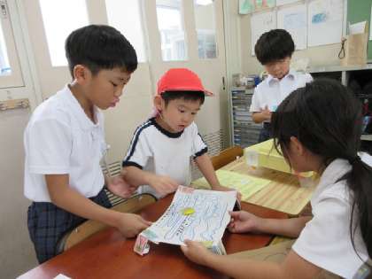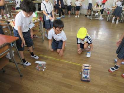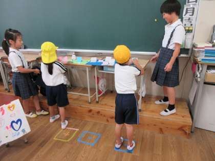 2年生がおもちゃランドに招待をしてくれ、身近な紙コップや箱などでつくった動くおもちゃでたくさん遊ばせてもらいました。遊び方を教えてもらったり、優しく声をかけてもらったりしたことで安心して遊んでいた子どもたちでした。年長児は、特に就学への期待につながる活動になりました。