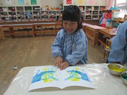 画用紙を開く時には、「わ〜!」と歓声が上がり、「虹みたい!」「チョウチョみたい!」と模様の面白さを味わっていました。