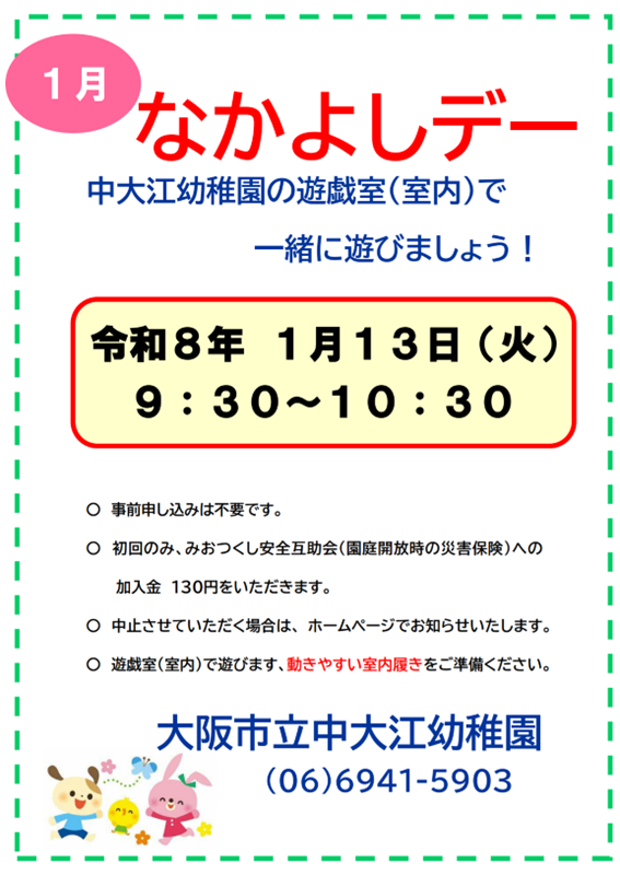 1月なかよしデー 公開日 2025/12/25 更新日 2025/12/25 幼稚園日記 地域の未就園児のお友達と、保護者の方を対象に遊戯室を開放いたします。中大江幼稚園の遊戯室で楽しく遊びましょう!〇日時 ・令和8年1月13日(火)9:30〜10:30 〇場所 ・中大江幼稚園 遊戯室 〇持ち物 ・室内履きを各自ご準備ください。1月なかよしデーのお知らせ いいね(0)