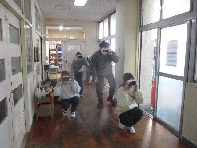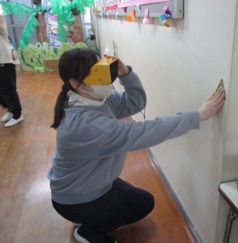 教職員が幼児視界体験メガネを使って、研修を行いました。このメガネは幼児の視野の広さを体験することができます。教職員がメガネをつけて園内に危険な場所があるかどうか探しました。危ないと思った場所には12月の保健指導で年長児が貼った「あぶないマーク」を貼りました。教職員からは、「こんなに視野が狭いのかと驚いた」という声が聞かれました。この体験を踏まえて園内の環境を整えながら、子どもたち自身が安全に対する意識を高められるようにしていきたいです。