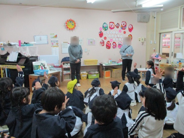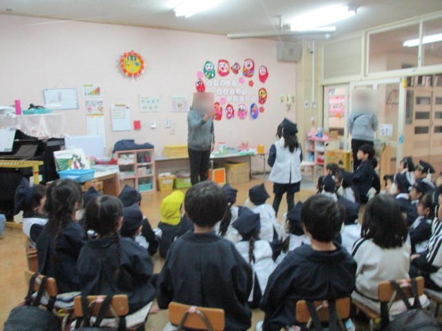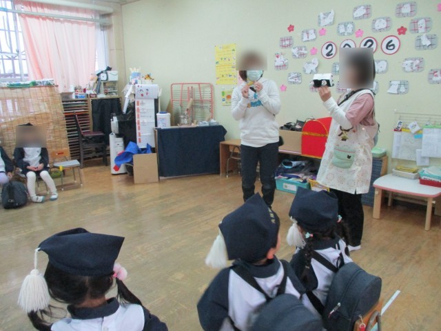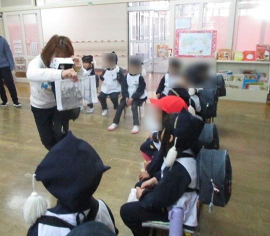 大人が子どもに変身できるメガネ(幼児視界体験メガネ)を使って、先生もあぶないマークを貼ったことを子どもたちに伝えました。どのクラスからも「(新しい場所に貼っている)マークがあるの知ってるよ」「ドアについてるよ」「トイレにもあったよ」とさっそく新しいマークを見つけていることを教えてくれました。「あぶないマークが貼ってある場所ではどうしたらいいかな?」という教師の問いかけには「周りをよく見る」「歩くよ」と話してくれ、安全に対する意識が高まっていると感じました。指導後も友達同士で「ここにもあぶないマークあるね」「あぶないマークがあるから気を付けないと」と話している姿が見られます。3学期も大きなけがなく元気にすごしましょうね!