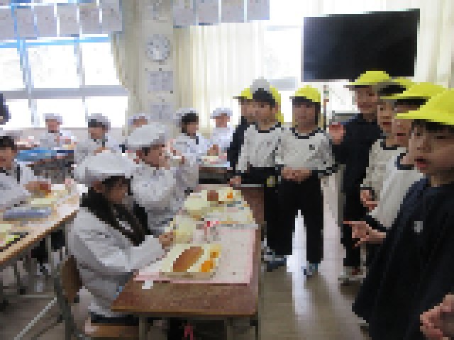 きく組(5歳児)は、1年生の給食参観に行ってきました。