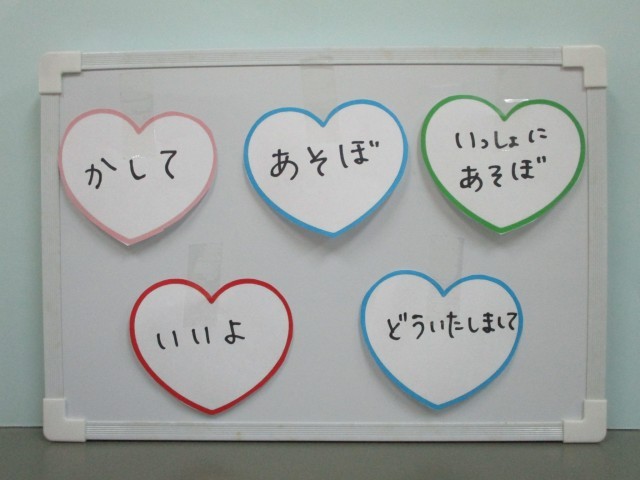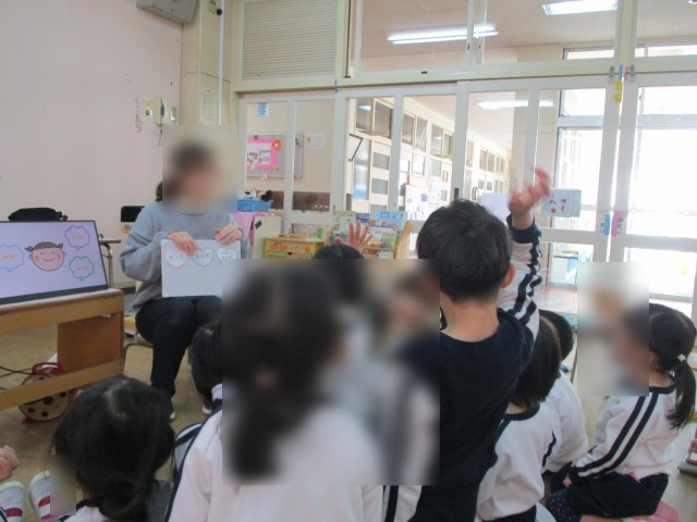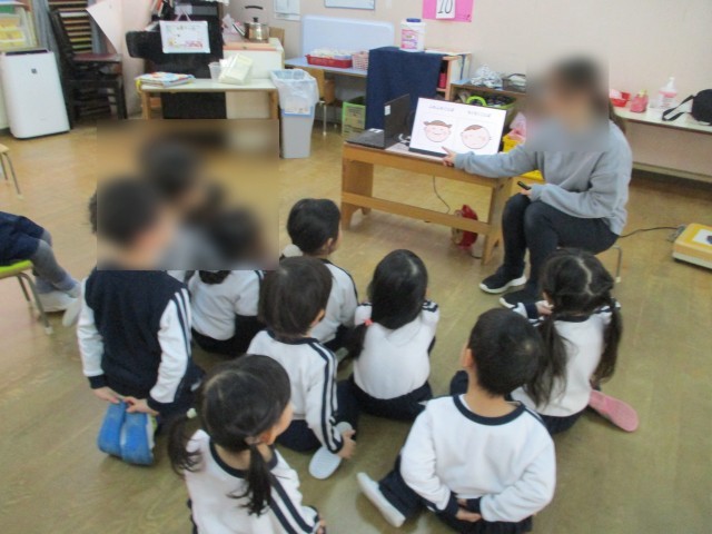 年少児には「ふわふわ言葉」についての保健指導を行いました。ふわふわ言葉とは誰かに言われると嬉しくなる言葉のことです。さくら組さんがふわふわ言葉でいっぱいになるように今まで友達に言われて嬉しかった言葉を聞くと「一緒に遊ぼう」「貸して」「いいよ」などたくさんのふわふわが集まりました。たくさんのふわふわ言葉が集まったのを見て嬉しそうにしている姿が印象的でした。